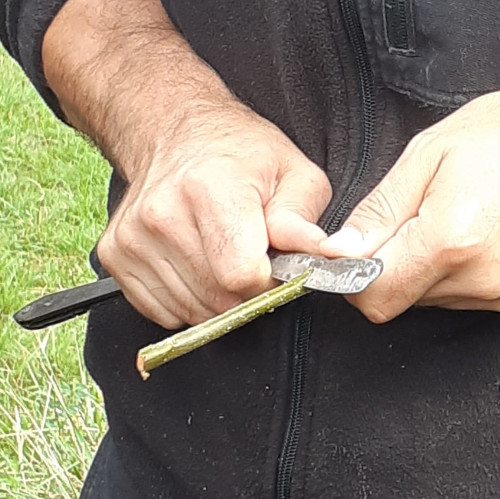 – Préparer le porte greffe en faisant une entaille en bas en tenant le rasoir à 45° (1). Puis 3 cm plus haut, avec le rasoir toujours à 45°, pousser le rasoir afin de retirer un petit morceau d’écorce avec du bois (on doit voir le liseré foncé du cambium) d’environ 3 cm (2).
